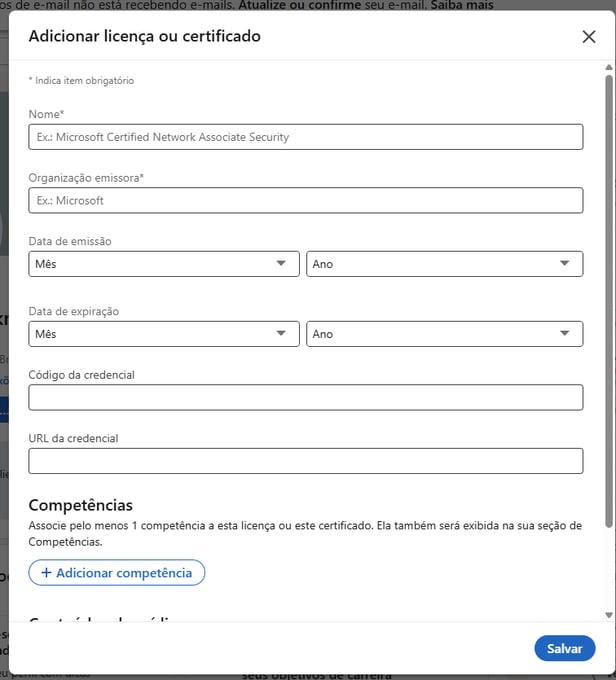 - URL da credencial: Este campo é opcional. Se o seu certificado tiver uma versão online acessível por um link, cole o endereço aqui.