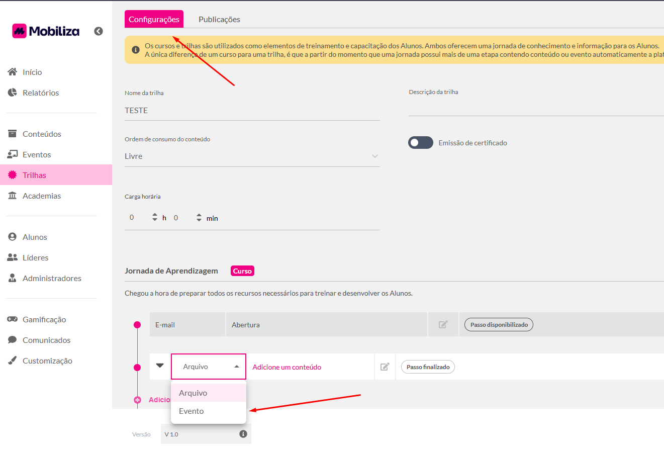 Para que a trilha e o evento fiquem visíveis para os alunos, a trilha precisa ser publicada em uma Academia. Acesse a aba “Publicações” na trilha e vincule-a às academias desejadas e ative a trilha. Lembre-se que a academia também precisa ter o status “Publicado”.