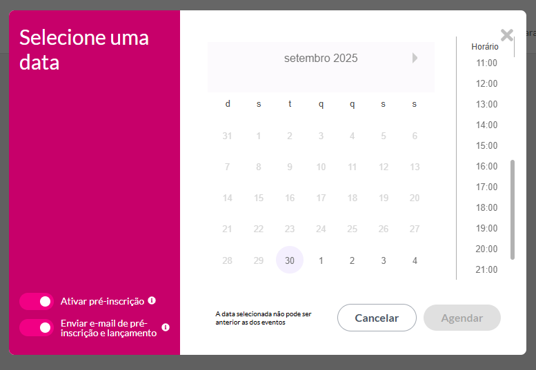 Utilize a combinação de agendamento com pré-inscrição para gerar expectativa e medir o interesse em um novo treinamento. Você pode divulgar o curso com antecedência e acompanhar o número de pré-inscrições antes mesmo do lançamento oficial.