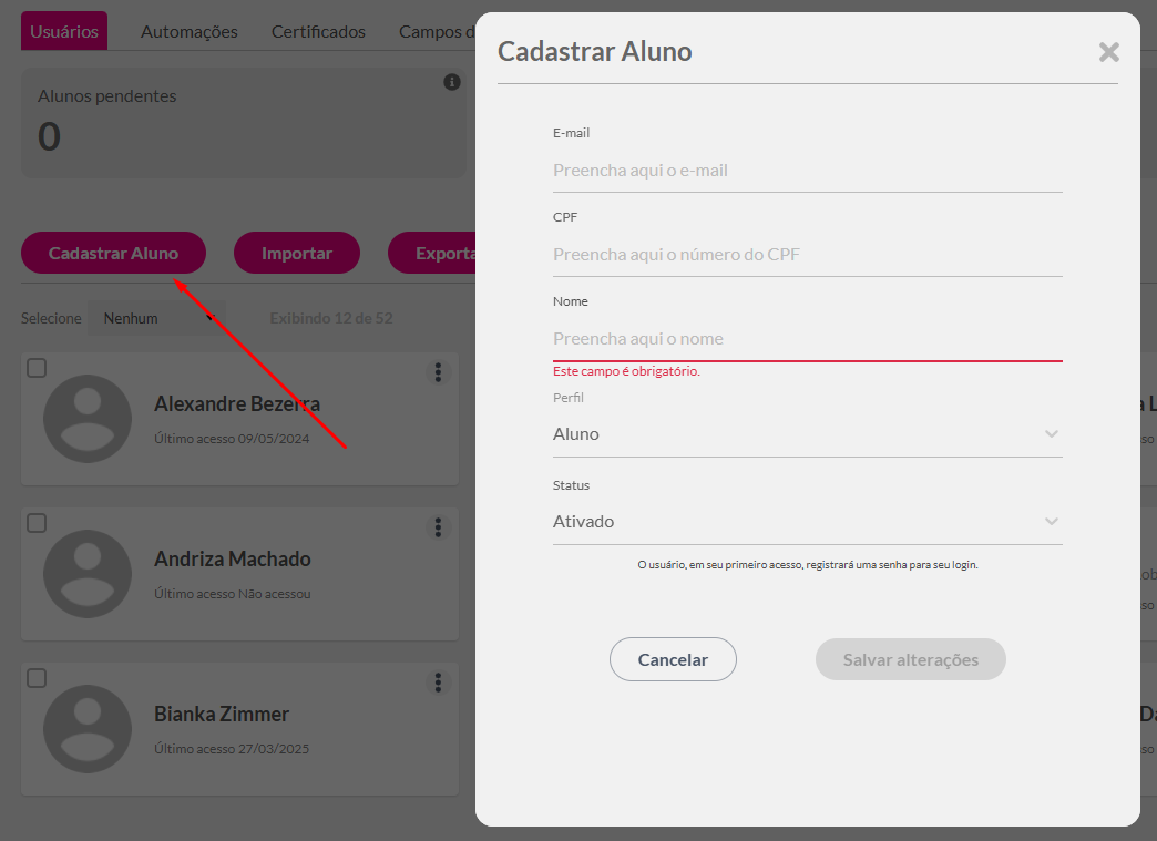 - Clique no botão “Adicionar Aluno”, localizado no canto superior direito.