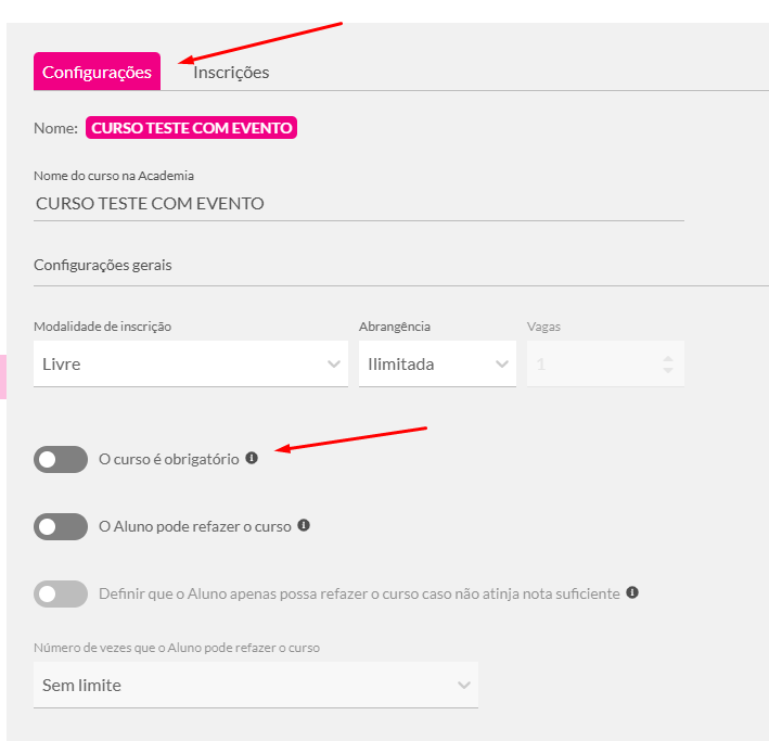 - Na aba de configurações, marque a opção “Curso Obrigatório”.