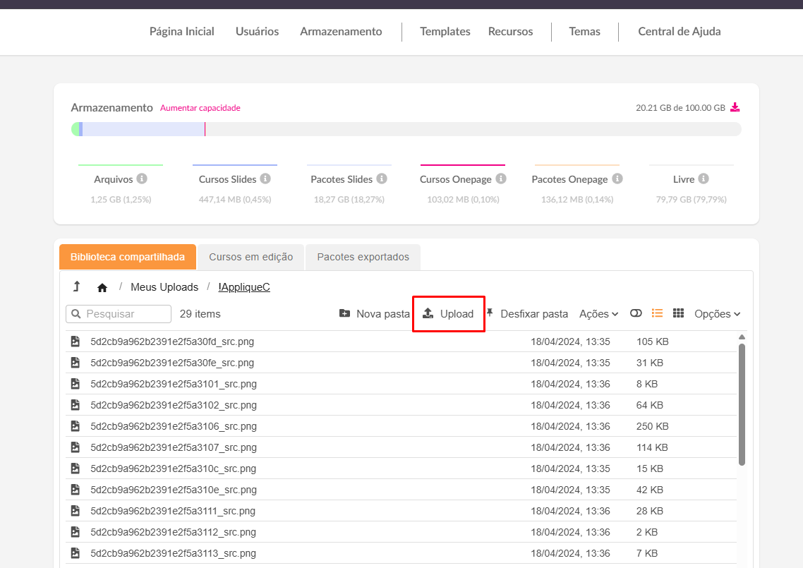 - Crie Pastas Temáticas: Antes de fazer o upload, pense na estrutura. Crie pastas por curso, módulo ou tipo de mídia (ex: "Imagens Cursos Vendas", "Vídeos Institucionais"). Para isso, use o botão “Nova pasta”.