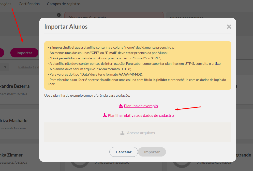 É fundamental utilizar o modelo de planilha fornecido pela plataforma. Não altere os nomes das colunas e certifique-se de salvar o arquivo final no formato CSV com codificação UTF-8 para evitar erros durante a importação. Você pode adicionar novos valores nas colunas de sua tabela (eles serão criados como campos adicionais para todos os alunos).