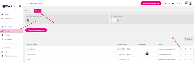 - Onde configuro as diferentes turmas de um mesmo evento? As turmas são gerenciadas na aba “Edições” na tela de edição do evento. Cada edição representa uma turma, com sua própria data, local e lista de presença.