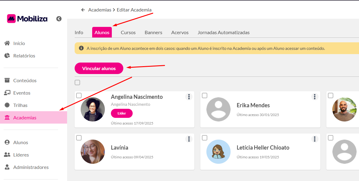 Como matricular (vincular) alunos nas Academias