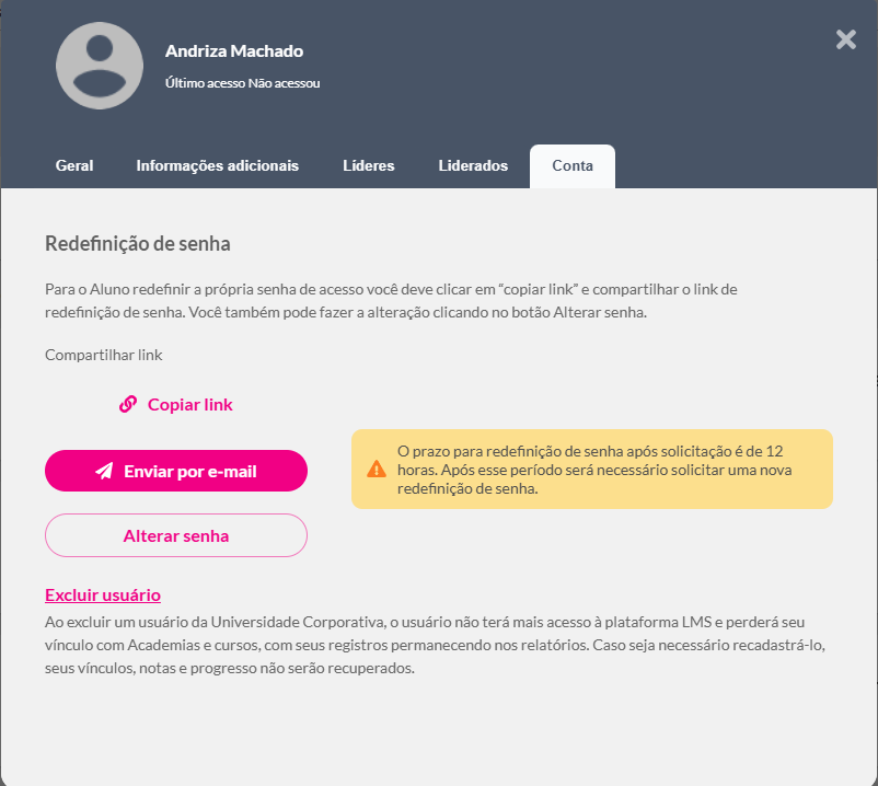 - Copiar link de redefinição: A plataforma irá gerar um link para que você possa enviar manualmente ao aluno, para realizar o processo de redefinição de senha.