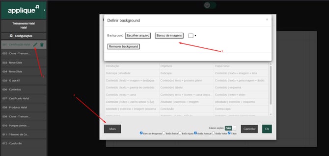 Com o seu projeto aberto no Applique Slides, selecione o slide que deseja editar. Na seção “Mais”, escolha uma das três opções disponíveis: