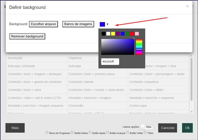 - Cor Sólida: Clique na caixa de cor e selecione a cor desejada ou insira um código hexadecimal (ex: #050035).