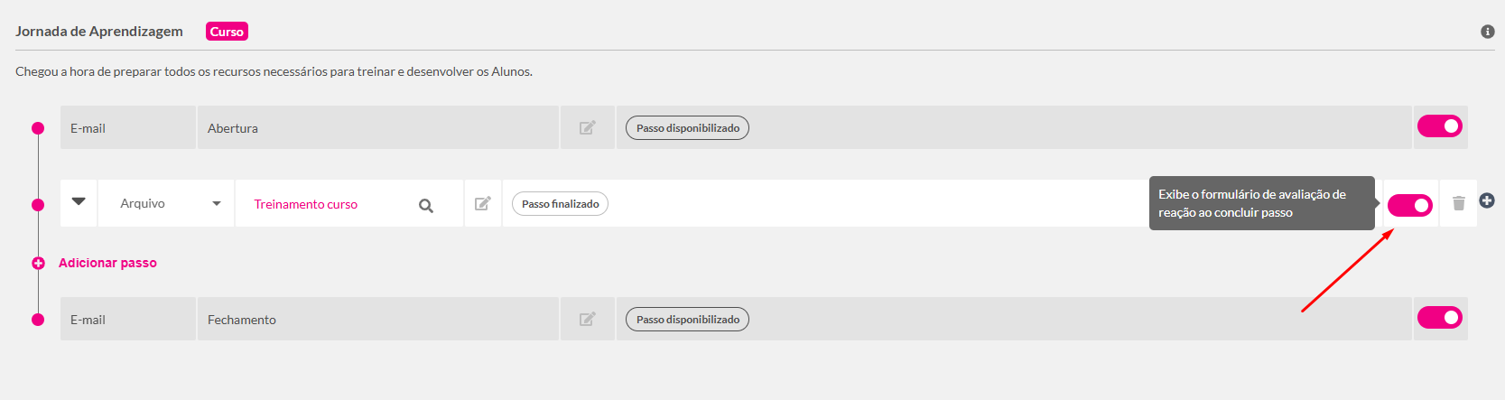A avaliação de reação é habilitada por padrão. Caso precise desativá-la para um curso ou trilha específica: