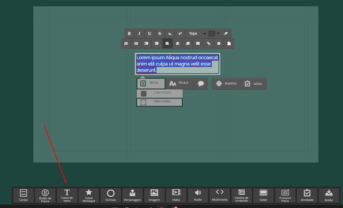 - Na barra de ferramentas inferior do editor, clique no ícone Caixa de Texto. Uma nova caixa de texto aparecerá no centro do seu slide.