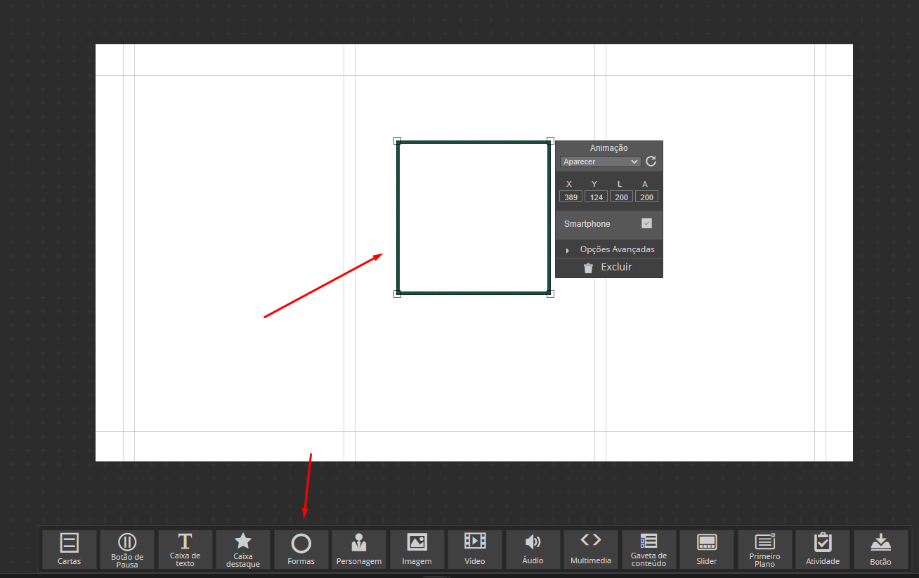 - Tipo de Forma: Dê um clique duplo na forma para abrir o menu de opções e escolher entre os formatos disponíveis (quadrado, círculo, etc.).