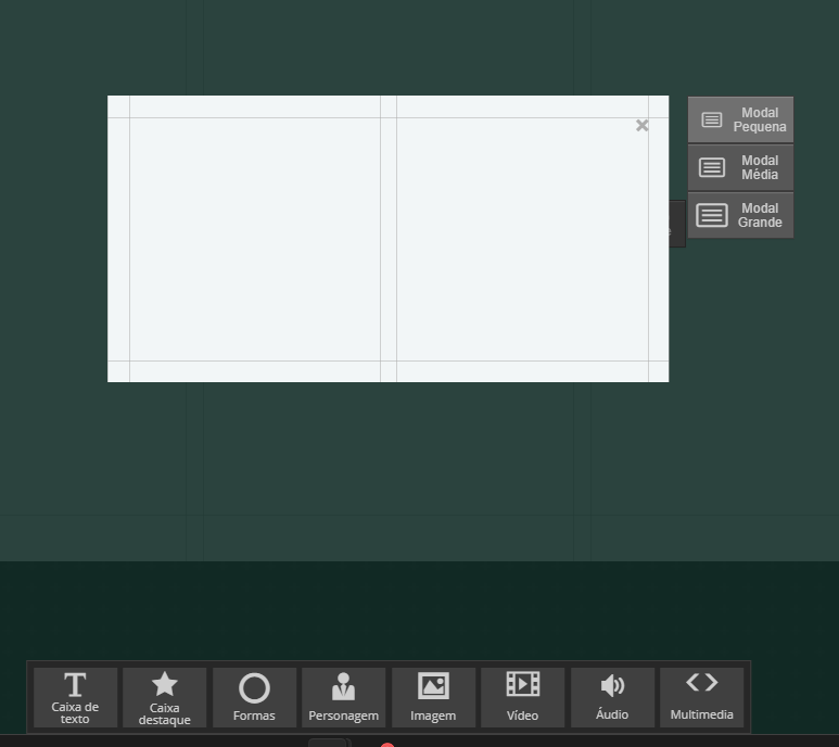 - Com o tamanho definido, comece a adicionar os elementos de conteúdo dentro da área do modal, utilizando a barra de ferramentas inferior para inserir Caixas de Texto, Imagens, Vídeos, etc.