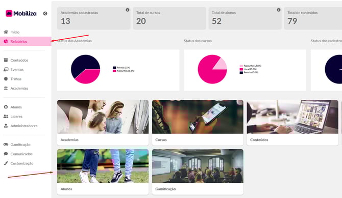 - No painel administrativo, acesse o menu lateral esquerdo e clique em “Relatórios”.