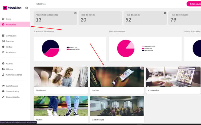 O Relatório de Conteúdos é a ferramenta central do Mobiliza LMS para analisar o desempenho e o engajamento dos alunos com os seus cursos. Nele, você pode visualizar quais conteúdos são mais acessados, acompanhar o progresso e as notas dos alunos, e coletar feedbacks através das avaliações de reação.