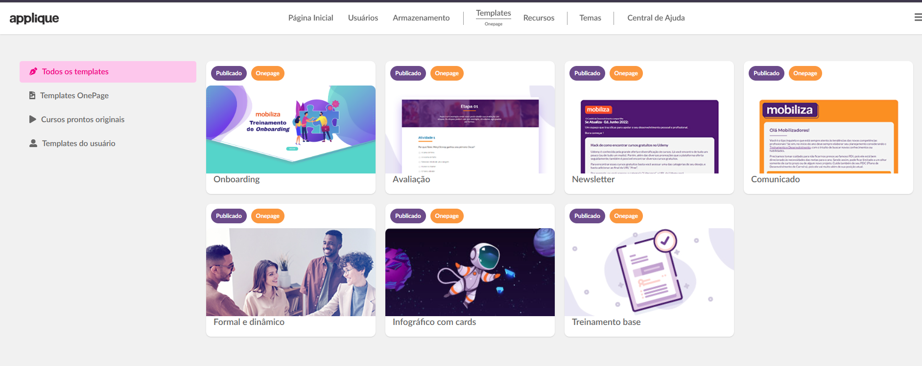 O Applique OnePage é uma ferramenta de autoria projetada para criar conteúdos de página única de forma rápida e intuitiva. Para agilizar ainda mais o seu processo de criação, a ferramenta já vem com uma galeria de templates prontos, cada um com um objetivo didático específico. Este guia apresentará os principais modelos disponíveis para que você possa escolher o que melhor se adapta ao seu conteúdo.