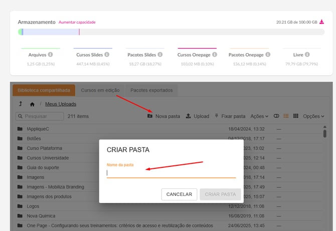 - Para Criar uma Pasta: Na tela principal do Armazenamento, clique no botão “Nova Pasta”. Dê um nome descritivo e clique em “Criar Pasta”.