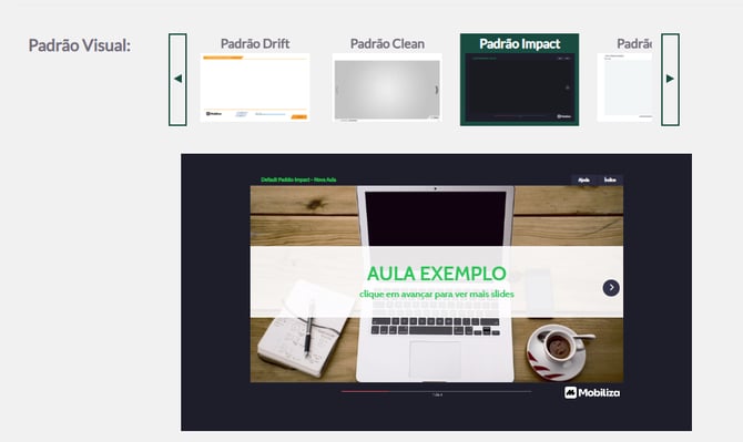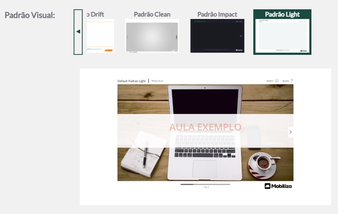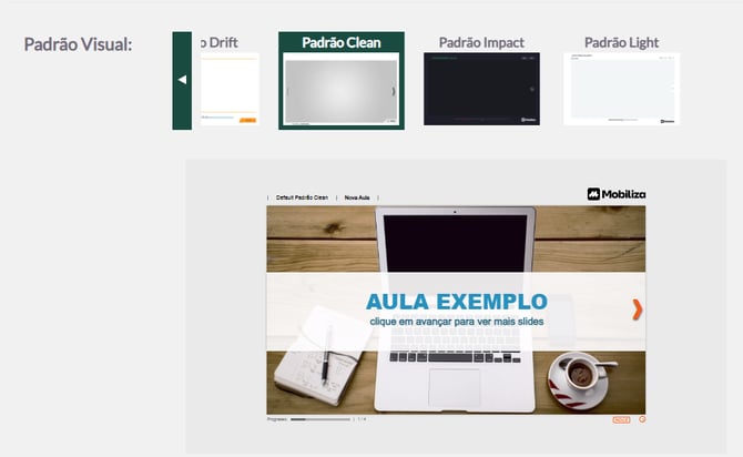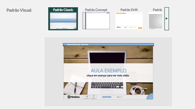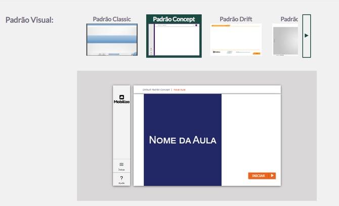 Os temas visuais (Light, Clean, Drift, Classic, Concept e Impact) definem a aparência e a estrutura do seu conteúdo no Applique Slides, incluindo o layout, as cores dos botões e a dimensão da área de conteúdo principal.