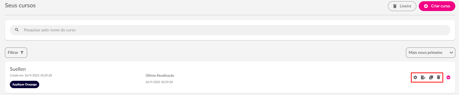 Para iniciar uma criação, clique no botão “Criar curso”. Você terá duas opções para o OnePage: